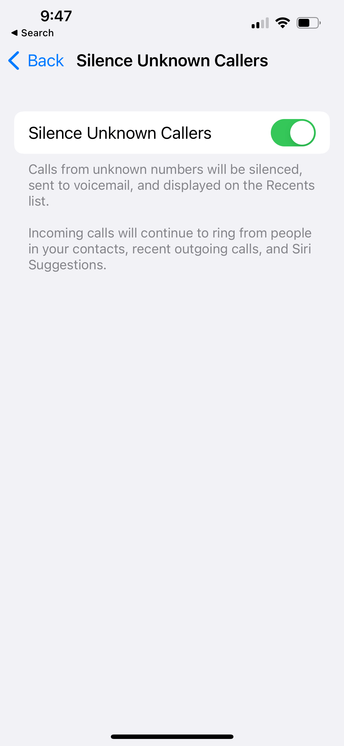 Sometimes, though, you’re waiting for an important callback from your… whatever, body shop, trial therapist, pharmacy… where you don’t have their number saved as a contact. With this setting on, I’m going to miss that call which, also makes me want to throw my phone in the ocean. I find myself fiddling with this setting with decent frequency. More so than other settings that are buried three levels deep.